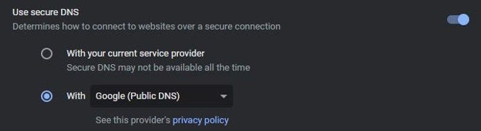 2. Chrome > Settings > Privacy and security section > Security > under Use secure DNS section > change from With your current service provider to With “Google (Public DNS)” or one of other 4 providers including one that has CleanBrowsing (porn filter). How to use Secure DNS (Under subheading Use secure connection...). You may need to re-tick and tick as it seems to drop off initially. Important: If your device is managed by your Organisation or parental controls are turned on, you can’t use Chrome’s secure DNS feature.