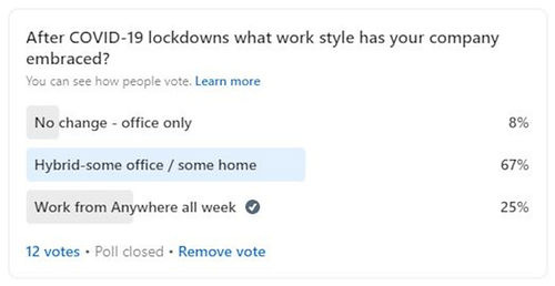 This is why hybrid work style is the most popular type which I quickly discovered after running a LinkedIn poll (required LinkedIn login to view) on the different work styles. 67% of people interviewed across Australia have embraced the hybrid work style and about 25% embraced work from anywhere all week (no office use). Folks this is here to stay.