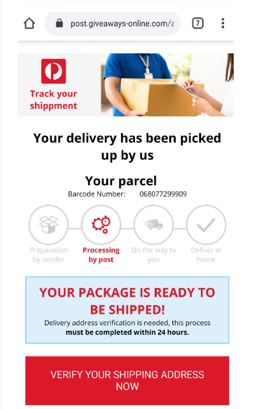 Email or text message you asking you to click on a link to print out a receipt or label for parcel collection and tracking, or to access your package.